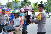 KILASRIAU.com - Satlantas Polres Inhil membagikan helm Standar Nasional Indonesia (SNI) dan bunga kepada penge.